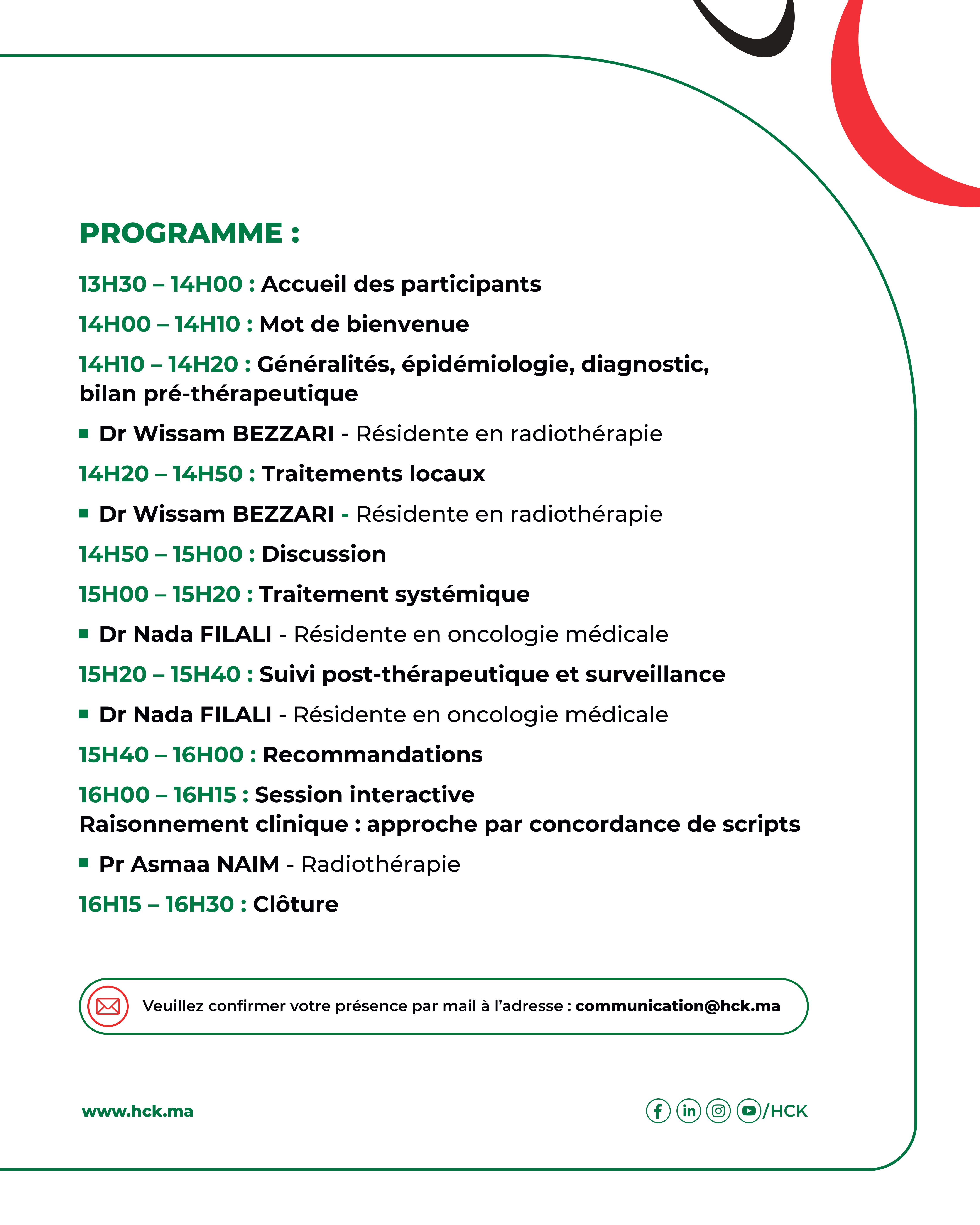 Veuillez confirmer votre présence par mail à l'adresse : communication@hck.ma